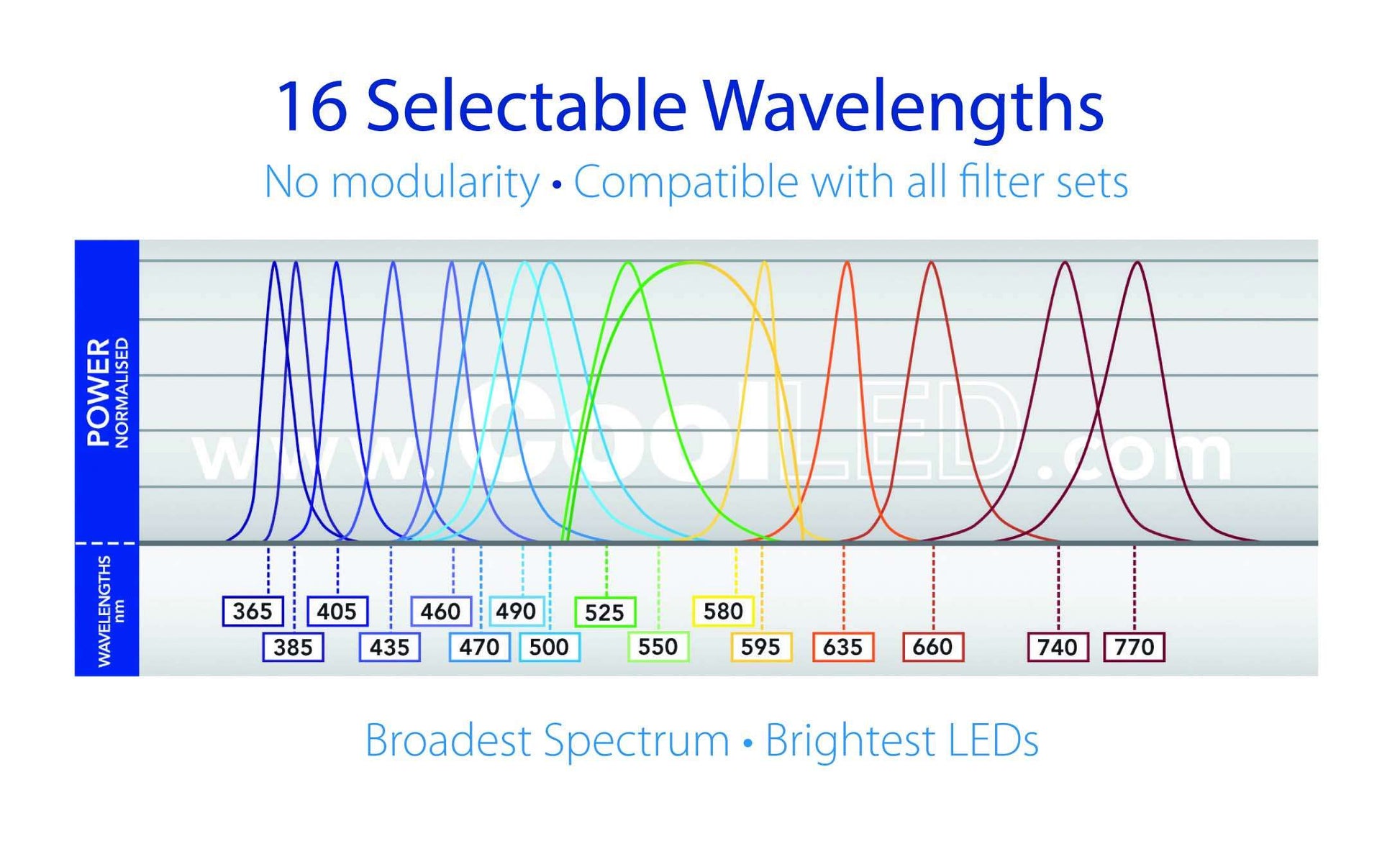 • Broadest LED spectrum available: 365-770 nm, with 16 LEDs