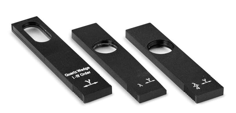 Polarising components Polariser and analyser, Bertrand lens, lambda (first class red), quarter lambda and quartz wedge (I-IV order) wave plates