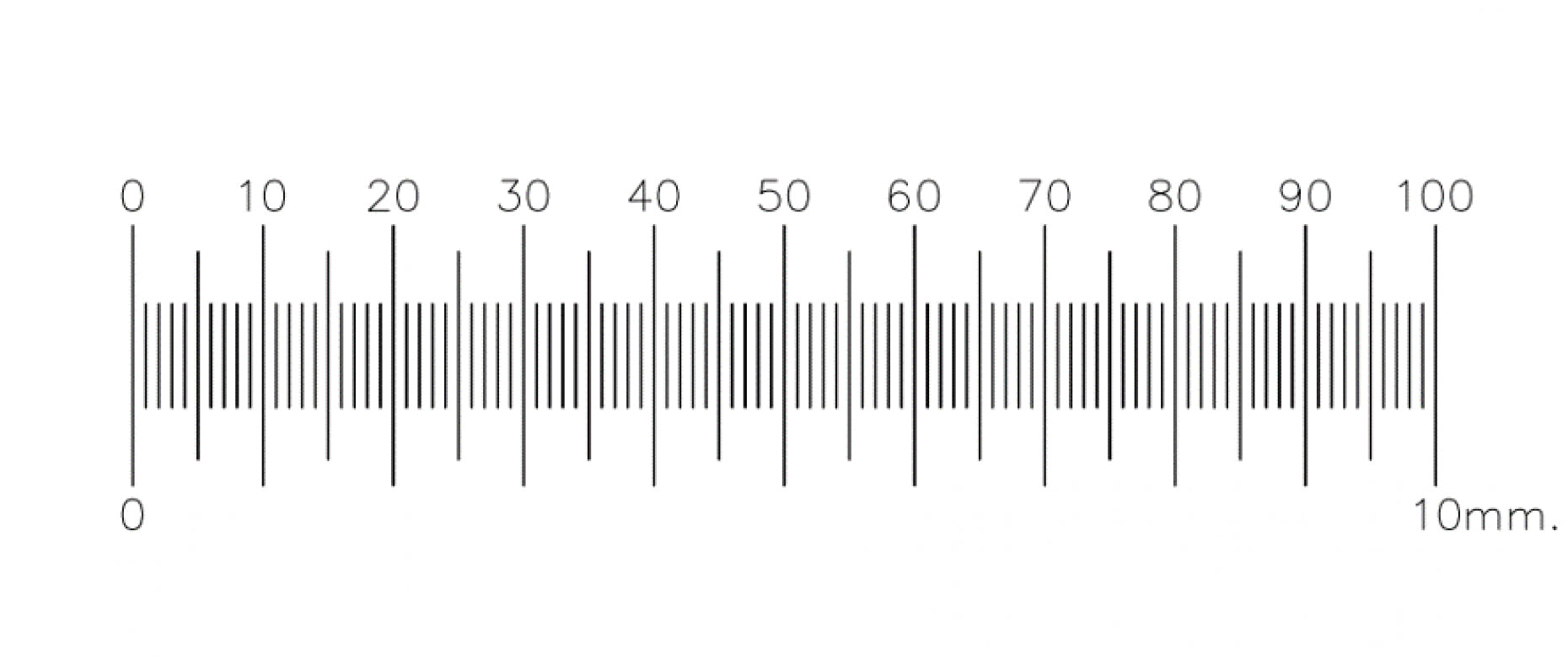 Calibration slide with 10mm scale subdivided into 100 divisions of 0.1mm (100µm). For reflected illumination