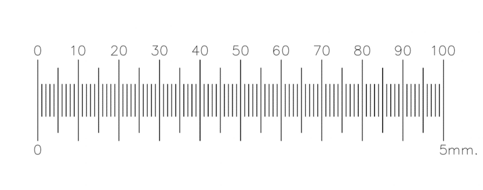 Calibration slide with 5mm scale subdivided into 100 divisions of 0.05mm (50µm). For Transmitted illumination.