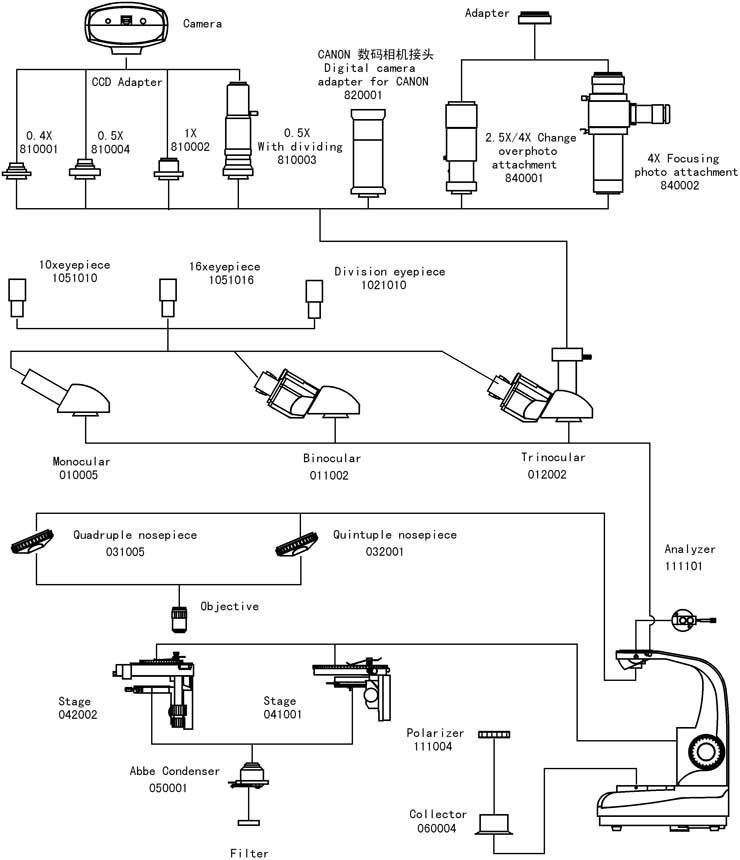 This microscope has a trinocular head, a pair 10x eyepieces with a crosshair, 4 achromatic objectives 4x, 10x, 20x, 40x (optional 60x and 100x oil objectives), a rotating, centerable stage, a retractable analyser in the head, rotatable polariser,  adjustable LED transmitted light,  Abbe condenser, and coarse/fine focus with adjustable tension and limit stopper