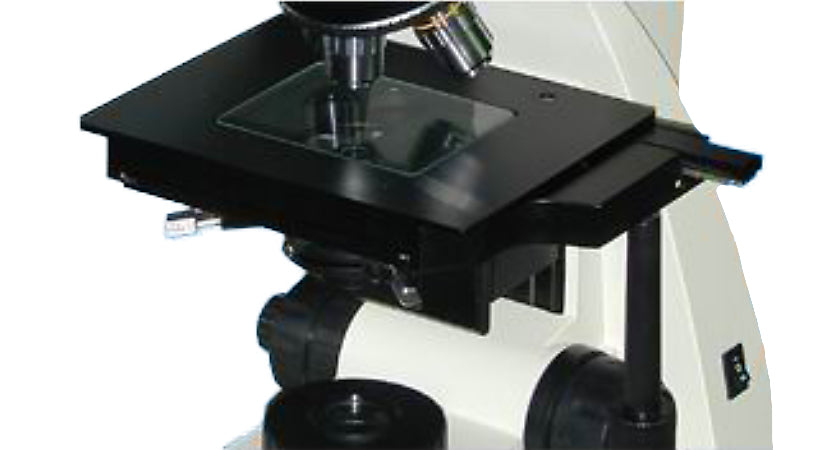 - A mechanical stage with ergonomically positioned controls for XY movement.