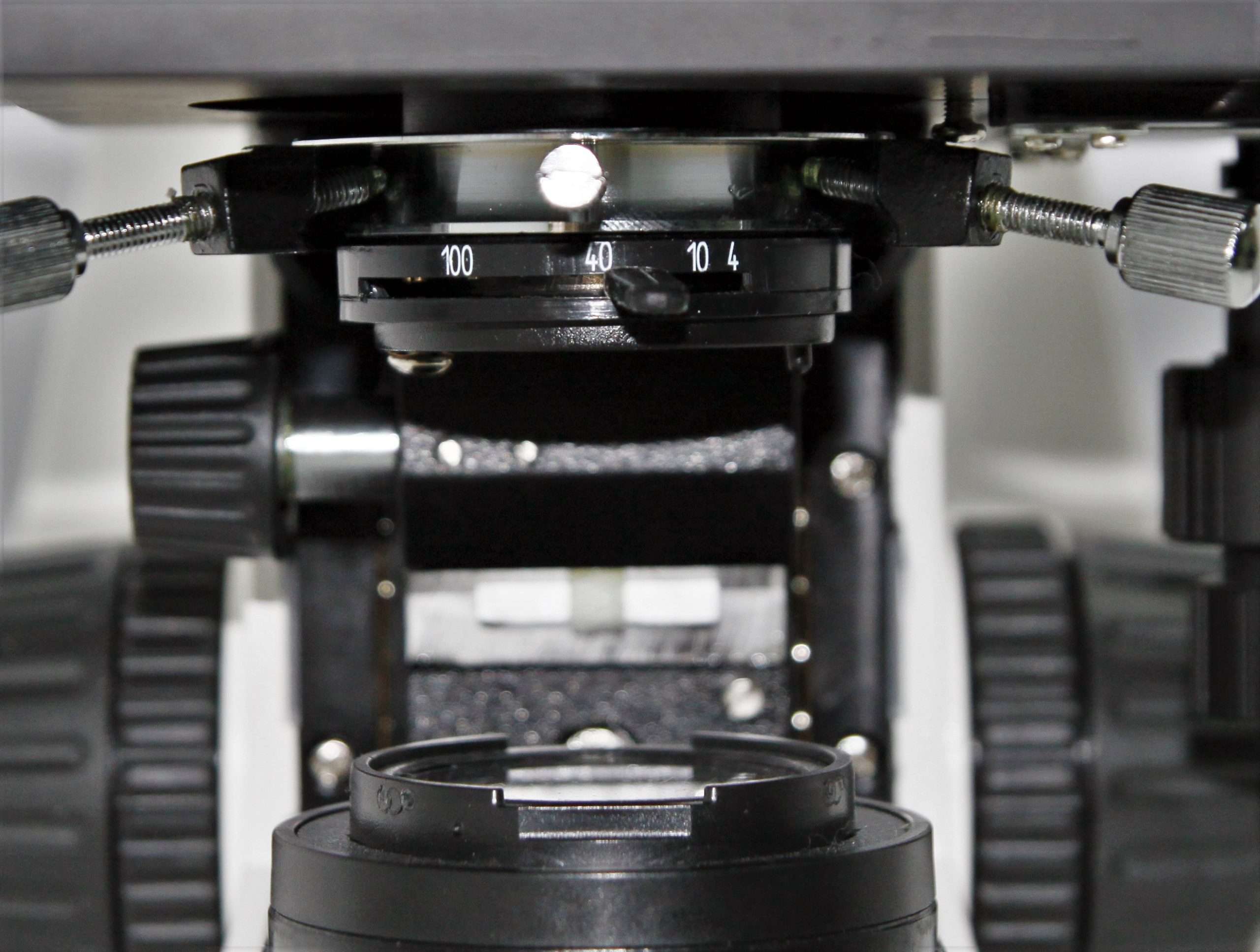 This model has a quadruple nosepiece with 4x, 10x, 40x and 100x oil objectives.