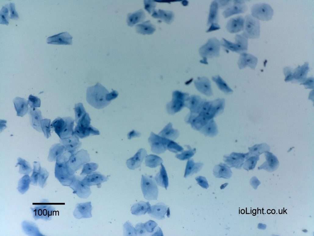 HUMAN CHEEK CELLSSTAINED WITH METHYL BLUE1mm clearly shows the cells and the nuclei, which are harder to see on the 2mm. However, the 2mm version makes cell counting much easier. |