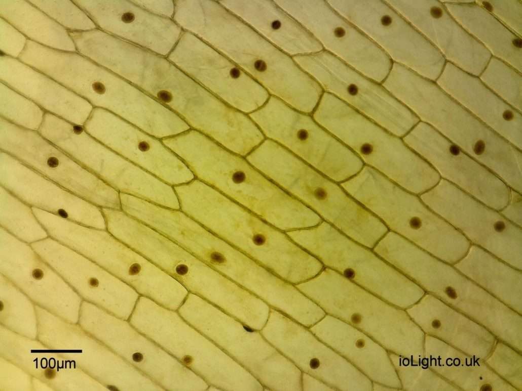 ONION CELLS STAINEDWITH IODINE1mm clearly shows the cells, cell walls and the nuclei. 2mm shows a larger area, but less detail |
