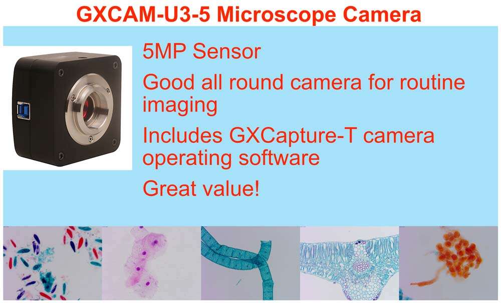 The GXCAM-U3-5 is part of our latest range of high performance, superb quality, USB-3 microscope cameras, featuring superfast refresh rates, amazing image quality, low noise, high sensitivity and excellent colour reproduction. Each camera incorprates the very latest camera sensor technology which delivers the very high quality images displayed using the free powerful GX Capture-T Software. These cameras attach to any c-mount camera adapter including eyepiece tube adapters.