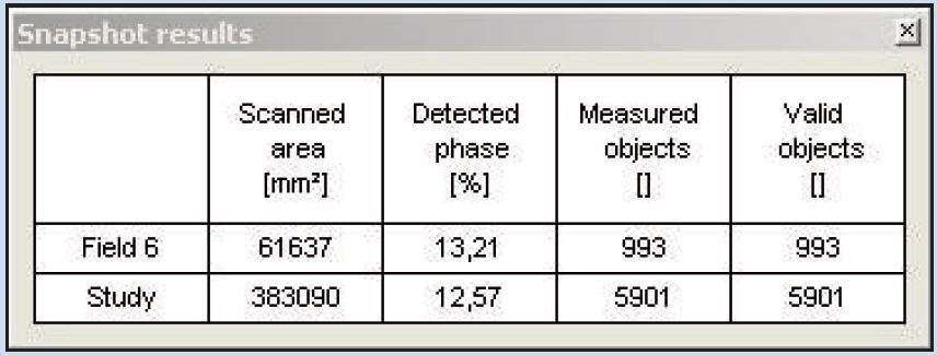 This software, if required, will orchestrate capture from a camera, movement by a motorised stage, automatic focussing by motorised focus, automatic calibration selection from a motorised microscope objective turret, automatic adjustment of image brightness, automatic background correction for uneven illumination, automatic feature detection, automatic feature separation and rapid analysis of dimensions and shapes and the immediate classification of the data into tables and graphs.