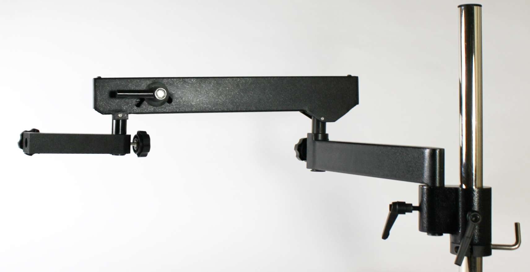 An ‘End Arbour’ is a high grade steel pole onto which microscope holders (also known as focussing rings) and other devices can be attached.  They are hinged at the top with a clamp so the angle of the arbour and therefore the attached holder can be adjusted.  At the bottom the have a knurled cap which screws into the end, it is removed so that holders can be slid onto the arbour and it is then replaced to prevent any possibility of the holder from sliding off.  At the top they have an ‘E-Arm’ which is a special 5/8th inch diameter spigot (with a recessed clamping section).  This inserts into the end of the Boom Arm (or Articulated Arm) and is firmly clamped into place.  End arbours are available in different diameters, the most common is 25mm and this must match the hole in the microscope holder.