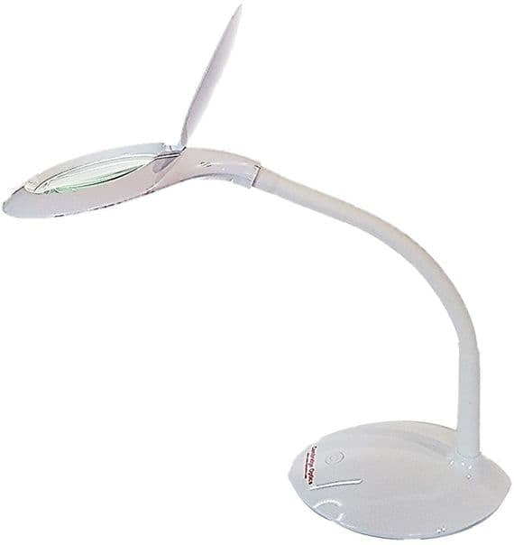 Large Lens, Stylish, Goose Neck, Adjustable Intensity LED Illuminated desk stand magnifier , easily adjustable and very stable. Large 10cm diameter glass lens 3 diopter (1.75X). 170x140x330mm. Bright White 30 LED Illumination with diffuser for comfortable, glare free observation. Tiltable head includes a very useful hinged cover. Colour - white. Suitable for domestic. industrial, medical and professional use. Full manufacturer's warranty. Only 12V so very safe and extremely economical to use.