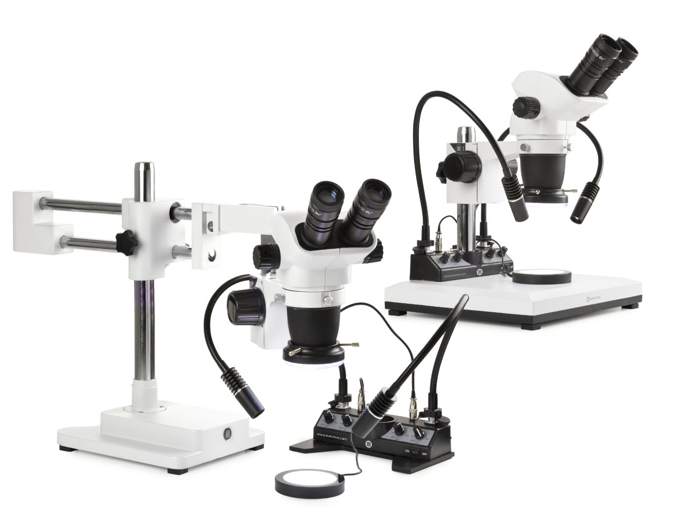 This illumination station comes with independently controlled goosenecks, a ring light and a transmitted stage illuminator making it a complete illumination solution. The base can be used as a standalone tabletop unit or can be slid over a pole stand